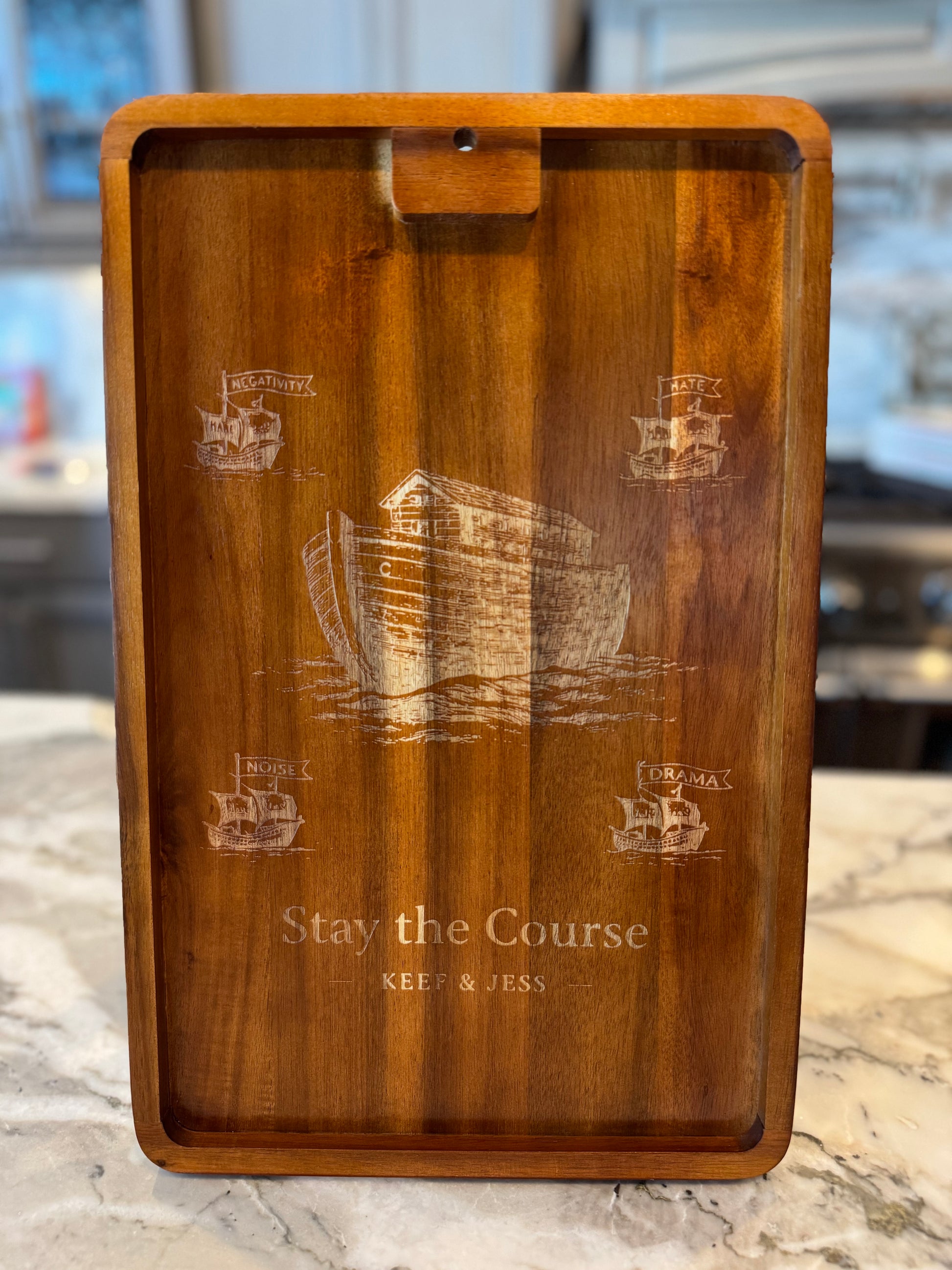 This Armrest Tray is made from premium Acacia wood and engraved with the inspiring phrase “Stay the Course.” A proud Keef & Jess creation, each tray showcases the unique character of natural wood, no two are exactly alike. Perfect for holding snacks, drinks or books with a mobile device holder. Finished in a light brown stain.